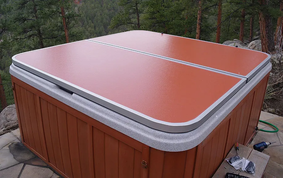 - The top surface is aluminum with a baked on enamel painted finish (like the hood of car). There are twelve designer colors available to coordinate with most spas and backyard color schemes.